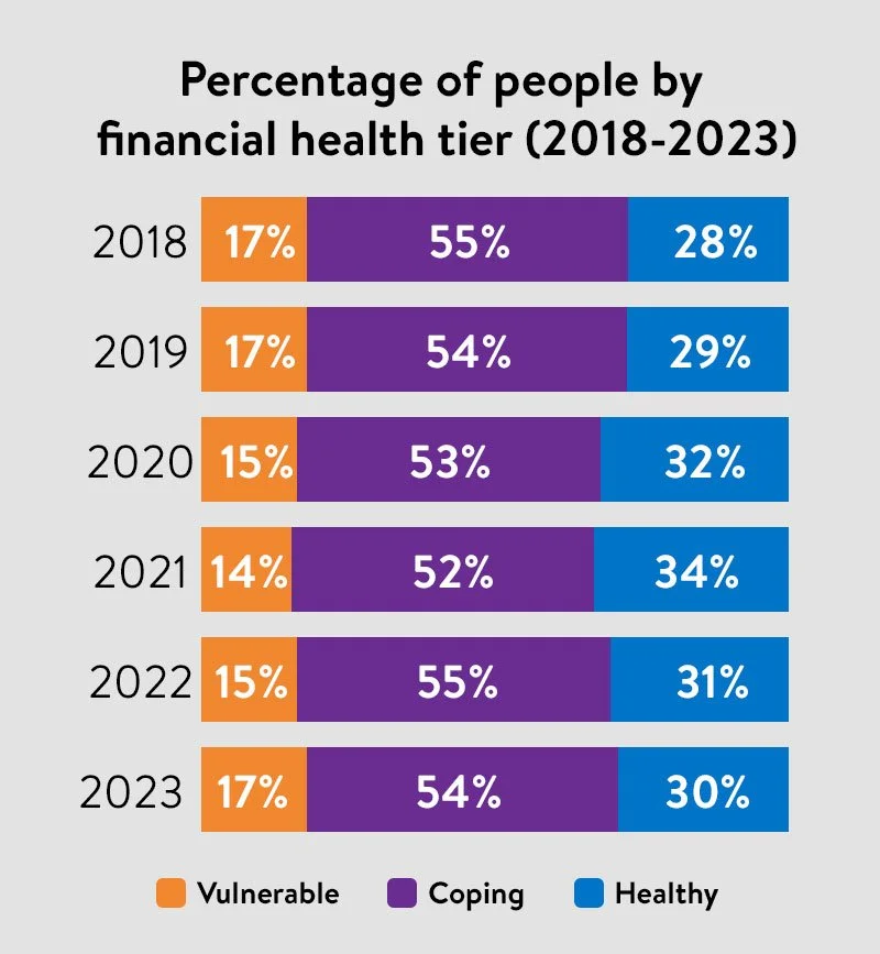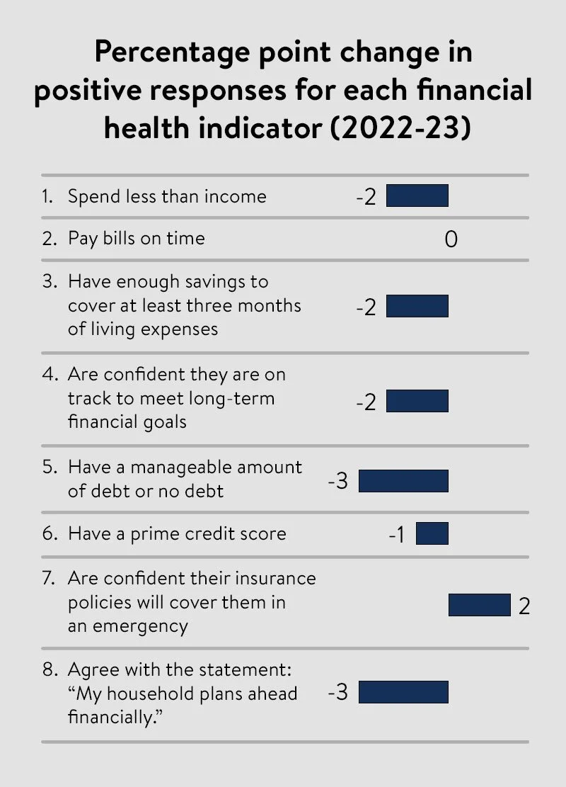 The report underscores decline across all four pillars of financial health: spending, saving, borrowing and planning.