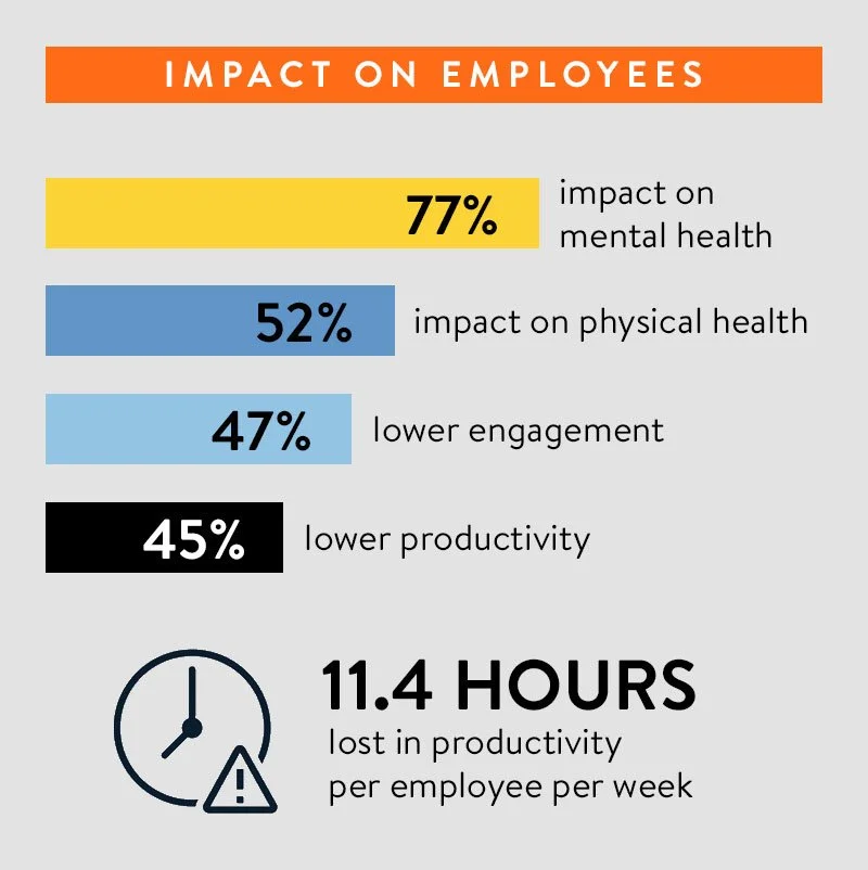 Financial stress in the workplace manifests into issues of mental and physical health, lower engagement and lower productivity. Per employee, it’s estimated that as much as 11.4 hours of productivity is lost per week. Over the course of a year, a full-time employee may spend more than 590 hours (74 days) thinking about personal financial issues.