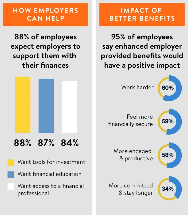 To combat the negative effects of financial stress and build a stronger team, consider offering a financial education program. In the Brightplan survey, financial education ranks as one of the most desired employee benefits, with the potential to have significant impacts on employee wellness and productivity.