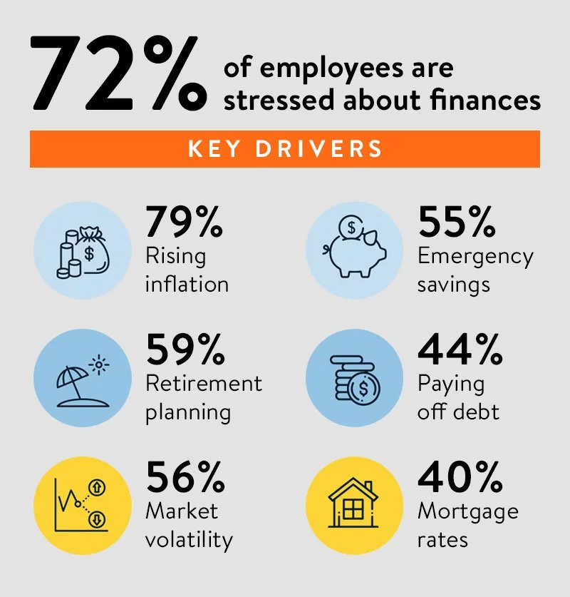 For employees, finances are the number-one source of stress. Recently, BrightPlan conducted a survey of employees from various industries, including technology, healthcare, financial services, education, manufacturing and energy. The study concluded that 72% of employees were financially stressed and listed inflation, retirement planning, stock market volatility, savings, debt and mortgage rates as the key drivers of stress.