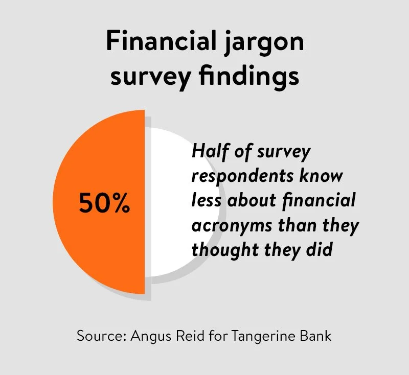A survey conducted by Angus Reid for Tangerine Bank revealed that only 3% of Canadians could identify the meanings of six common financial acronyms. These terms included TFSA (Tax-Free Savings Account), RSP (Retirement Savings Plan), GIC (Guaranteed Investment Certificate), ETF (Exchange-Traded Fund), ESG (Environmental, Social and Governance) and ROI (Return on Investment). These are fundamental concepts in personal finance and investing, yet their meanings are not widely understood.