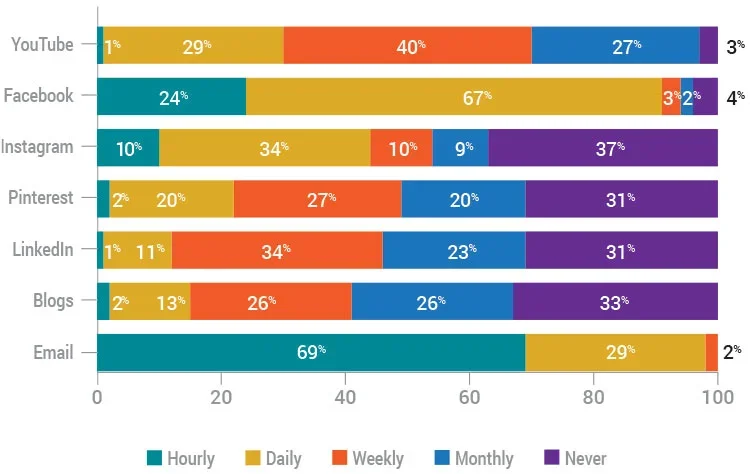 All of the respondents indicated that they use it, with 29 percent saying they do so daily and almost 70 percent reporting hourly usage! The second-highest platform in the hourly category was Facebook at 24 percent. That’s a whole lot of email usage.