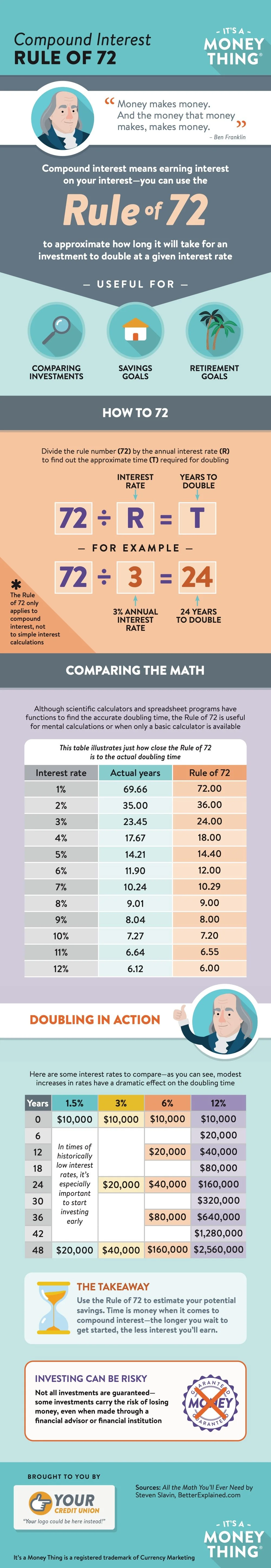 What can you do about it? If you want to be realistic about your investment earnings and help plan for your future, the Rule of 72 is a handy tool to quickly estimate how many years it will take to double your investment at a given rate. The Rule of 72 works with investments that have compounding interest. You simply divide 72 by the rate of annual return (that’s your interest rate). What results is an approximation of how many years it will take for you to double your investment. For example, if you park $1,000 in a CD yielding 2% interest, it will take 36 years to double (72/2=36). The Rule of 72 allows you to do some quick, back-of-the-envelope math when comparing different investment options or when planning out your long-term financial goals.