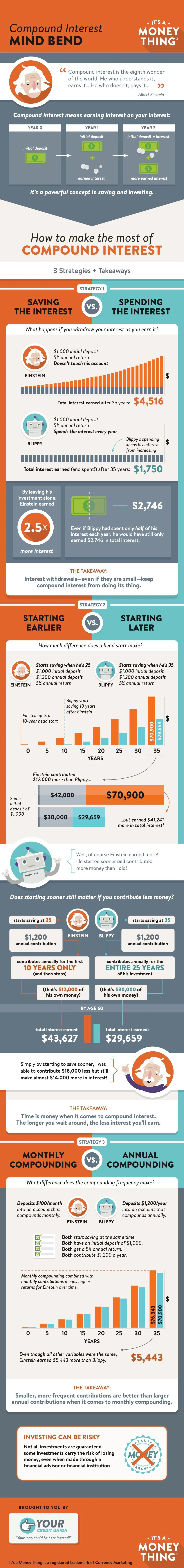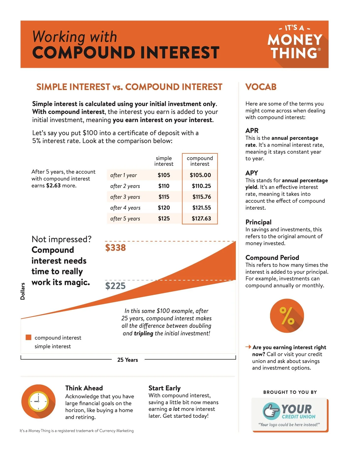The good news is that a little bit of your time and energy now can go a long way later. Make an appointment with your credit union to learn about their savings products. Take 10 minutes and set up a direct deposit into your savings account. When you’re dealing with compound interest, the longer you wait to get started, the less money you’ll earn in the long run.