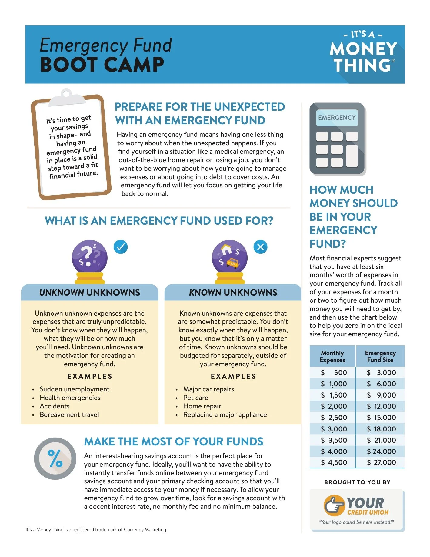 The materials in this content pack describe what an emergency fund is and is not, why you need an emergency fund, how much money should be in it and tips on putting that money aside