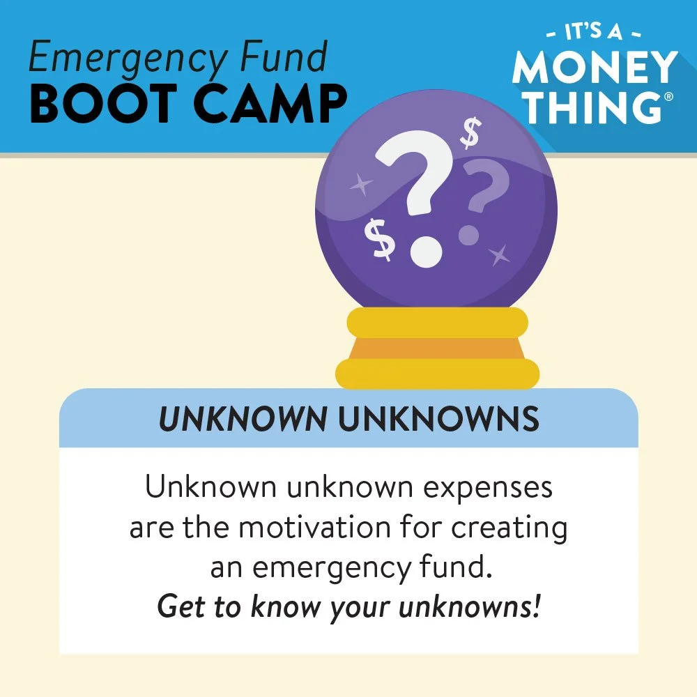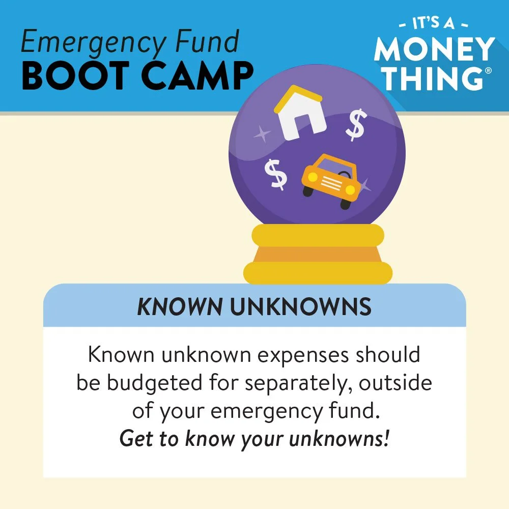 “Known unknowns” are situations that we can partially anticipate—so this is the type of expense that should not be dealt with by an emergency fund. These situations are on our radar (known), even if we don’t know exactly when they will happen (unknown). For example, if you own a vehicle, you know that at some point it will need repairs, just like you know that your home will eventually need a new furnace or that your pet will eventually need a visit to the vet.