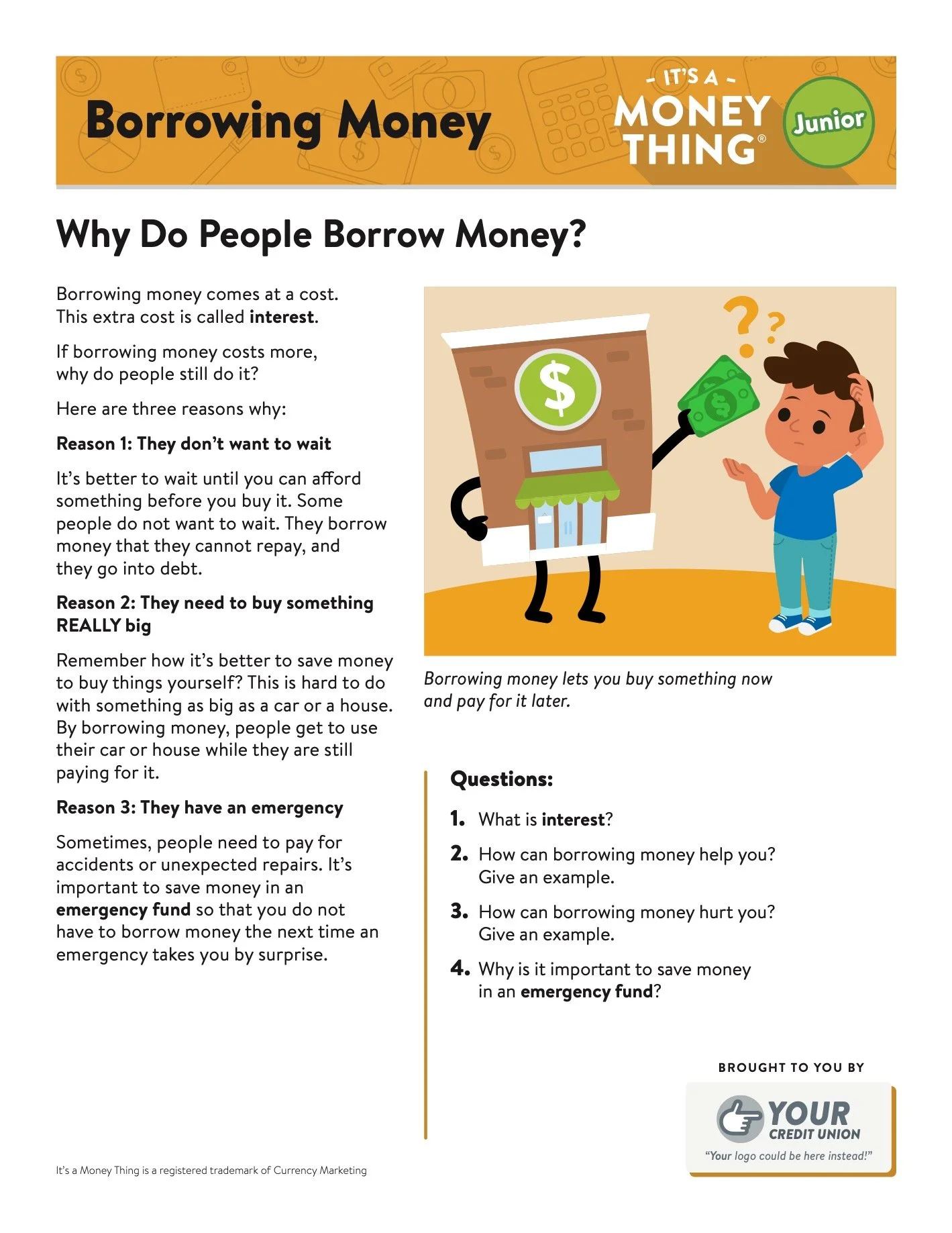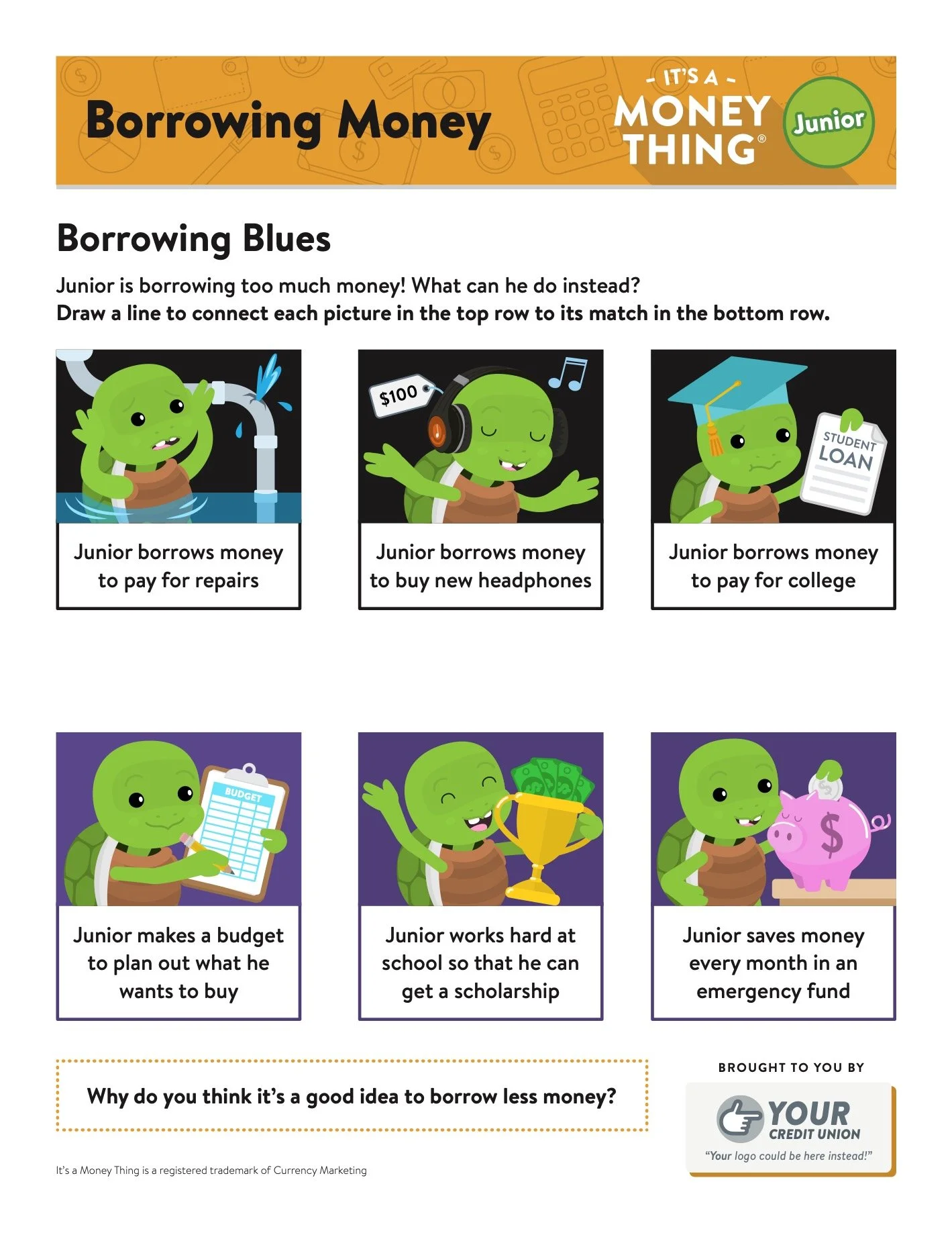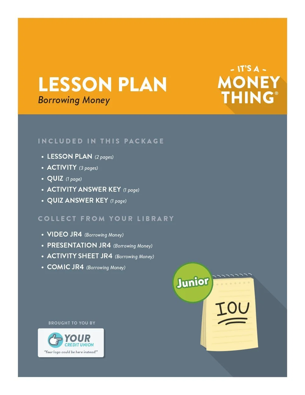 The materials in this pack show kids that there’s a cost to buying something now and paying for it later